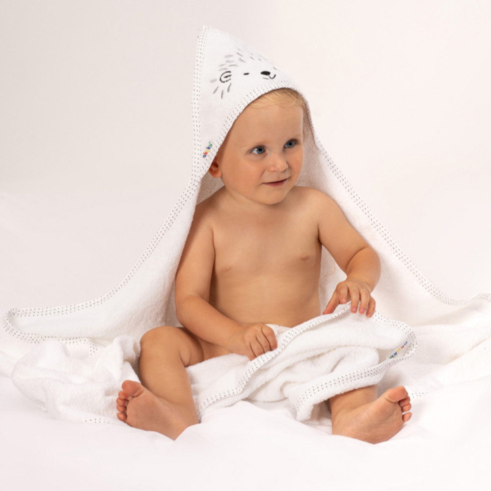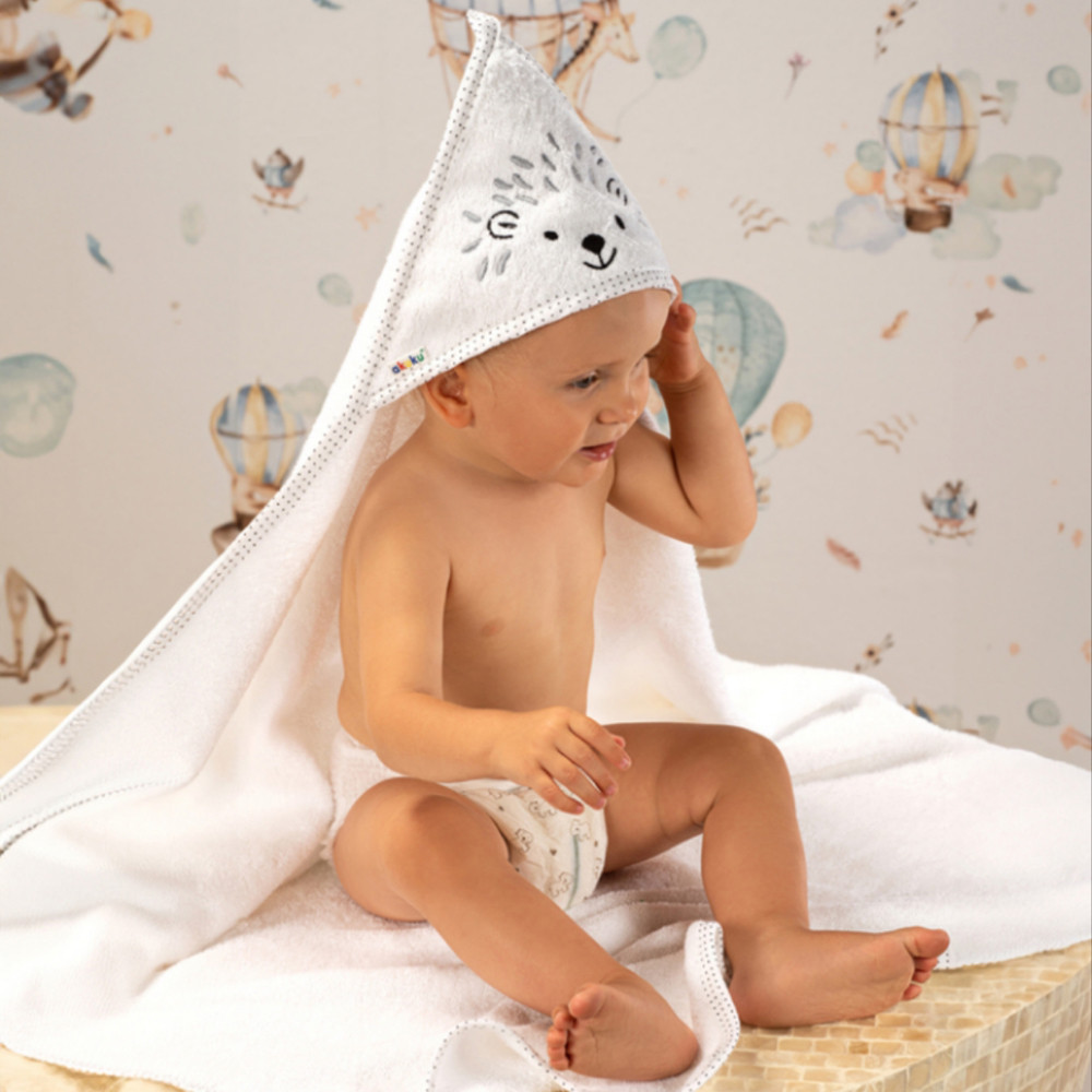 Ez a fürdőlepedő bolyhos frottírból készült . Már az első fürdéstől elengedhetetlen. Tökéletesen felszívja a nedvességet , és hatékonyan védi a kicsit a kihűléstől . A törölköző kivételesen puha és finom, így nem irritálja a bőrt. A laza szabás nem korlátozza és nem gátolja a baba mozgását. A beépített kapucni védi a nedves fejet .