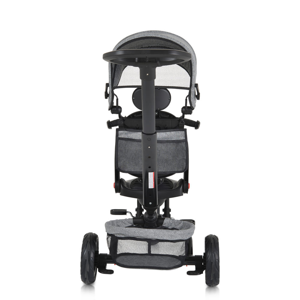 Kerekek - gumi, nem felfújható. Első kerék állítható szabadonfutó funkcióra. Levehető biztonsági karfa, 3 pontos biztonsági övek. Két hátsó fék. Első és hátsó játékkosár. Táska a tartozékok számára.
