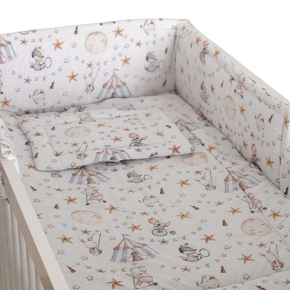 Három részes (takaró + párna + fejvédő) mosható ágynemű szett, színes vidám mintákkal, az anyukák és a kisbabák legnagyobb örömére. A fejvédő óvja a már fejét emelgetni tudó babát az ággyal való ütközéstől, mely kötők segítségével erősíthető a kiságyhoz. Az ágyneművel azonos mintájú anyagból elérhető babafészek, és kókuszpólya is.