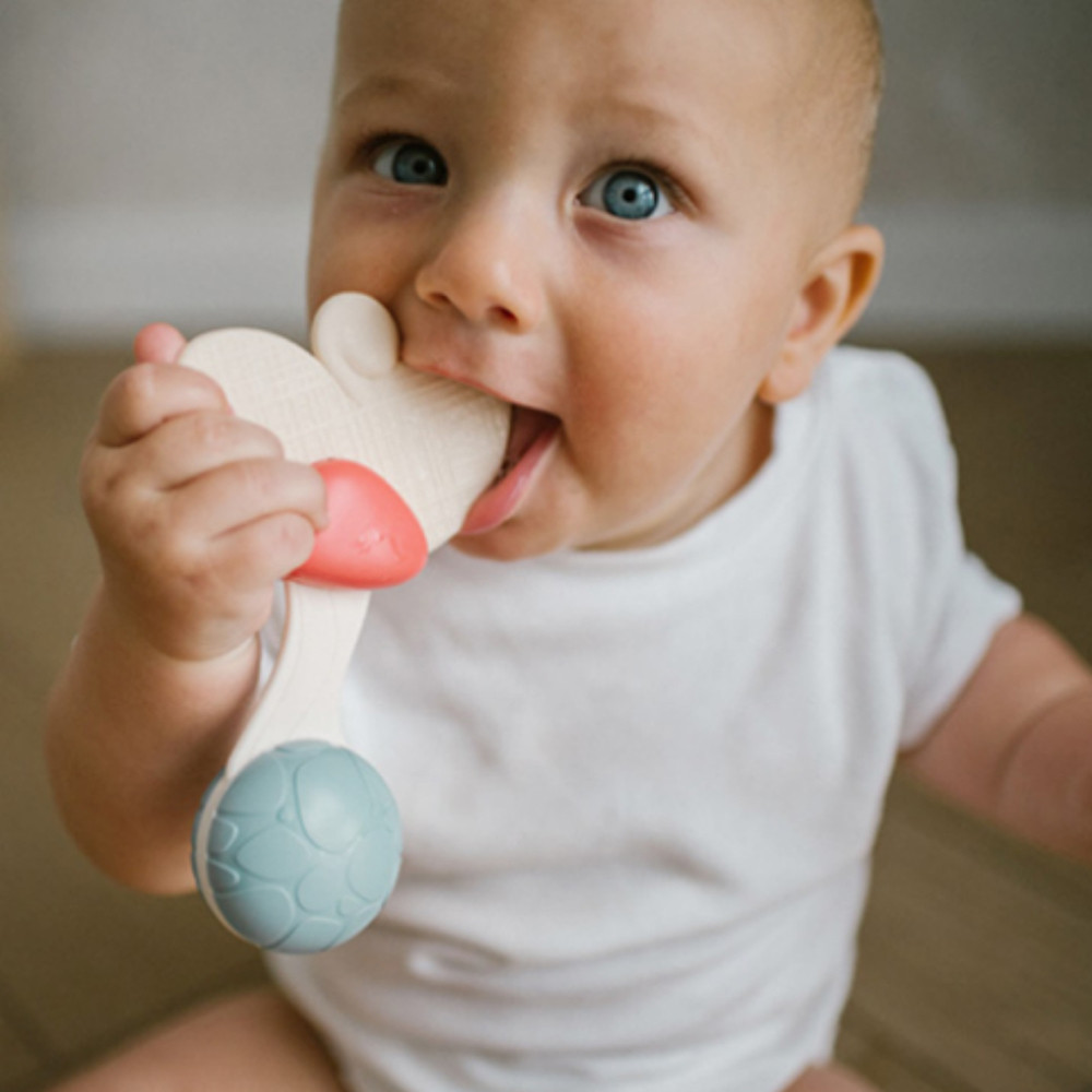A kellemes tapintású szilikon rágóka gyengéden masszírozza a baba ínyét, és segít enyhíteni a fogzási fájdalmat.