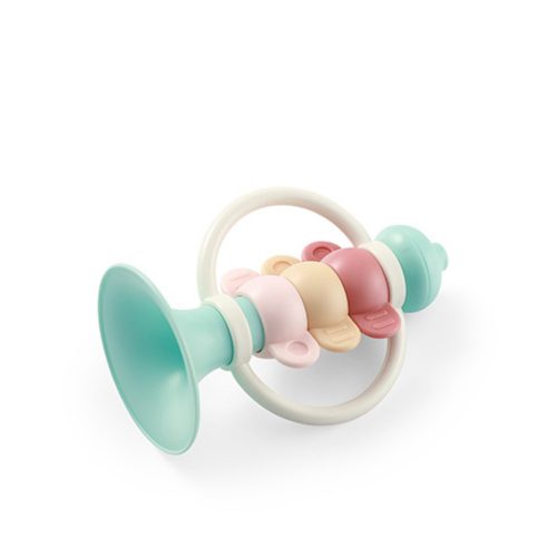 A csörgő rázogatásával a színes gyűrűk olyan hangokat adnak ki, amelyek felkeltik a baba figyelmét és fejlesztik a hallását.