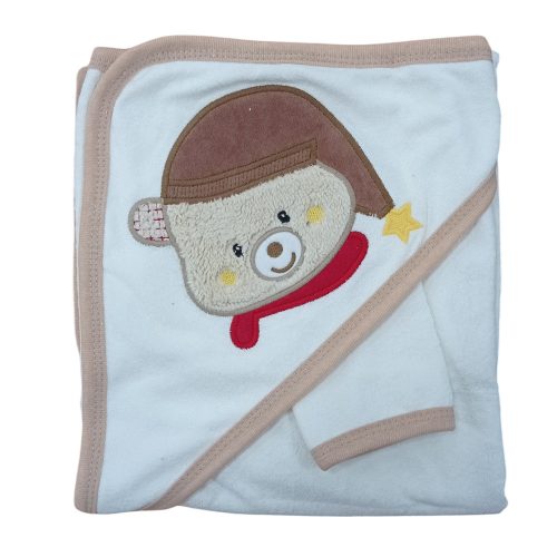 100% pamut, Mérete 85 x 90 cm, Szimpla falú frottír, Kapucnis, Mosdókesztyűvel, Hímzett mintával