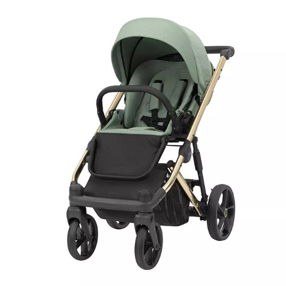 Elegáns babakocsi arany színű elemekkel, bármilyen időben tökéletes a sétához, köszönhetően:
