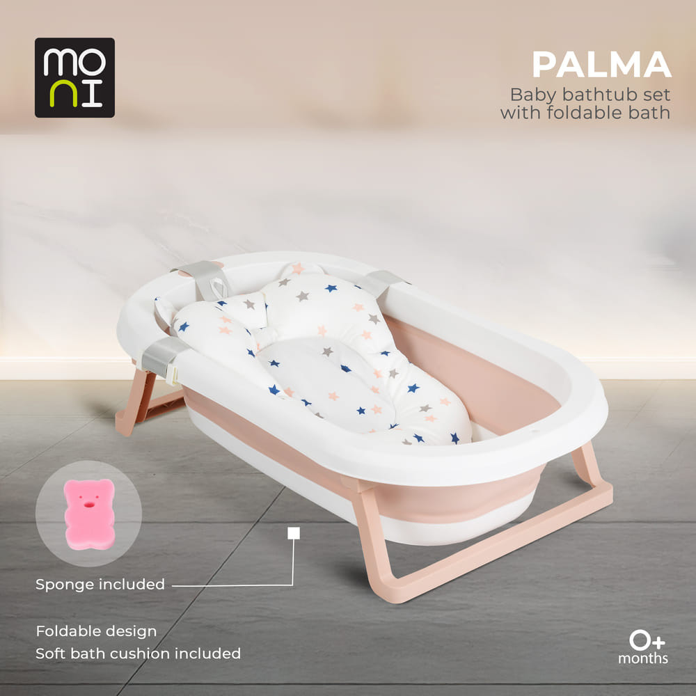 3 részes fürdőszett összecsukható káddal Palma, Moni - kényelem és komfort az első naptól kezdve! Tegye a fürdőzést élvezetes élménnyé ezzel a praktikus és stílusos, kifejezetten a kicsik számára tervezett szettel. Az újszülöttek számára 0+ hónapos kortól alkalmas, a funkcionalitást, a biztonságot és a kényelmet ötvözi egyben. A készlet a következőket tartalmazza: egy összecsukható fürdőkád 75*35*18,5 cm-es méretben - könnyen tárolható és helytakarékos; egy puha, 43x33 cm-es fürdőszőnyeg - a fürdetés közbeni gyengéd alátámasztásért; egy szivacs - alkalmas a baba érzékeny bőrére. Legfontosabb előnyök: - Összecsukható kialakítás - kompakt, ideális kis helyiségekbe. - Falra akasztható lehetőség - kényelmes és praktikus tárolás. - Csúszásgátló elemek a lábakon - a stabilitás és a biztonság érdekében. - Lefolyónyílás dugóval - a kád könnyű és gyors kiürítése. - Csúszásgátló talp a kádon - a nagyobb biztonság érdekében. - Kiváló minőségű, egészségre ártalmatlan anyagok. A Palma, Moni készletet a baba és a szülők szem előtt tartásával tervezték - a nagyobb biztonság, kényelem és nyugalom érdekében. FIGYELEM! A segédeszköz (kádszőnyeg) nem biztonsági eszköz. Akkor hagyja abba a fürdőalátét használatát, amikor a gyermek már képes felülni más segítsége nélkül.