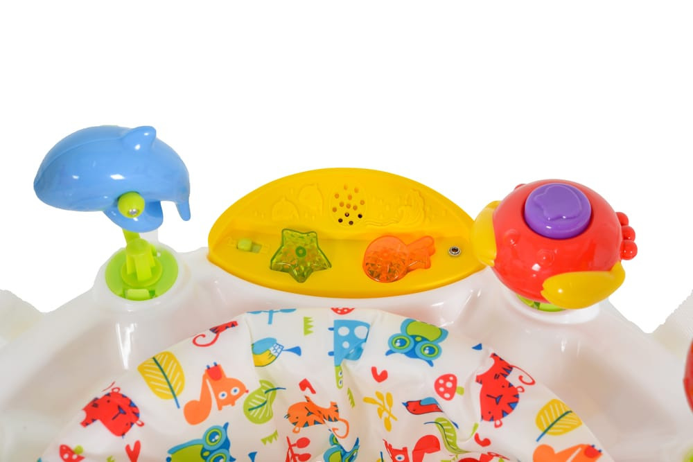 A beépített interaktív játékok különböző élénk színekben és formákban, valamint a fényekkel és két hangerősséggel ellátott zenélő tábla fejlesztik a