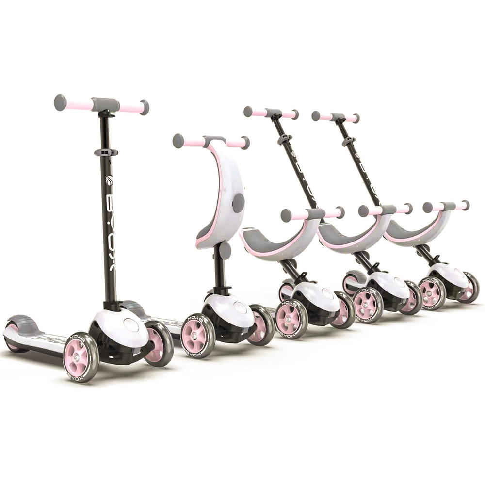 br />Összecsukható multifunkciós roller 4 az 1-ben. Az 1-es mód szülői felügyeletet biztosít 12 hónaposnál idősebb, legfeljebb 20 kg súlyú gyermekek számára; az ülés puha, textilborítású résszel és mozgatható lábtartóval rendelkezik. A 2. mód szülői felügyelet nélkül, a lábtartó pedig eltávolítható. A 3. mód az ülést kormánykerékké alakítja át, amelynek fix magassága 57 cm; a 4. mód a szülői vezérlést TPR markolattal ellátott kormánykerékké alakítja át, amelynek magassága 65 és 84 cm között állítható. A 3. és 4. üzemmódban a roller 3 év feletti, legfeljebb 50 kg-os gyermekek számára alkalmas; a kerekek PU ABEC-7 csapágyazásúak, az első kerekek 120x30 mm méretűek, és csak előre és hátrafelé mozgathatóak, dönthető állapotban nincs lehetőségük elfordulni, míg a hátsó kerék 100x50 mm-es, széles lábfékkel.