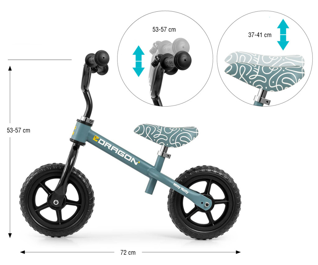 Termékleírás: 2 éves kortól használható fékkel ellátott, Állítható kormány magasság (54 cm - 60 cm) és nyereg (33 cm cm-ig 43 cm), Terhelhetősége: 20 kg, Defektmentes habkerekek, Bicikli súlya: 3 kg